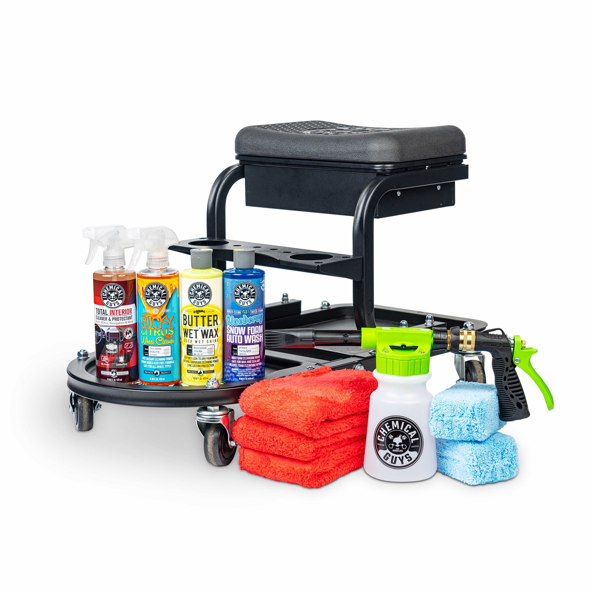 Sit back and relax on the Soft stool detailing cart while blasting foam with just your garden hose attached! This kit takes the stress out of long detailing sessions with everything you need for a satisfying showroom sparkle.
