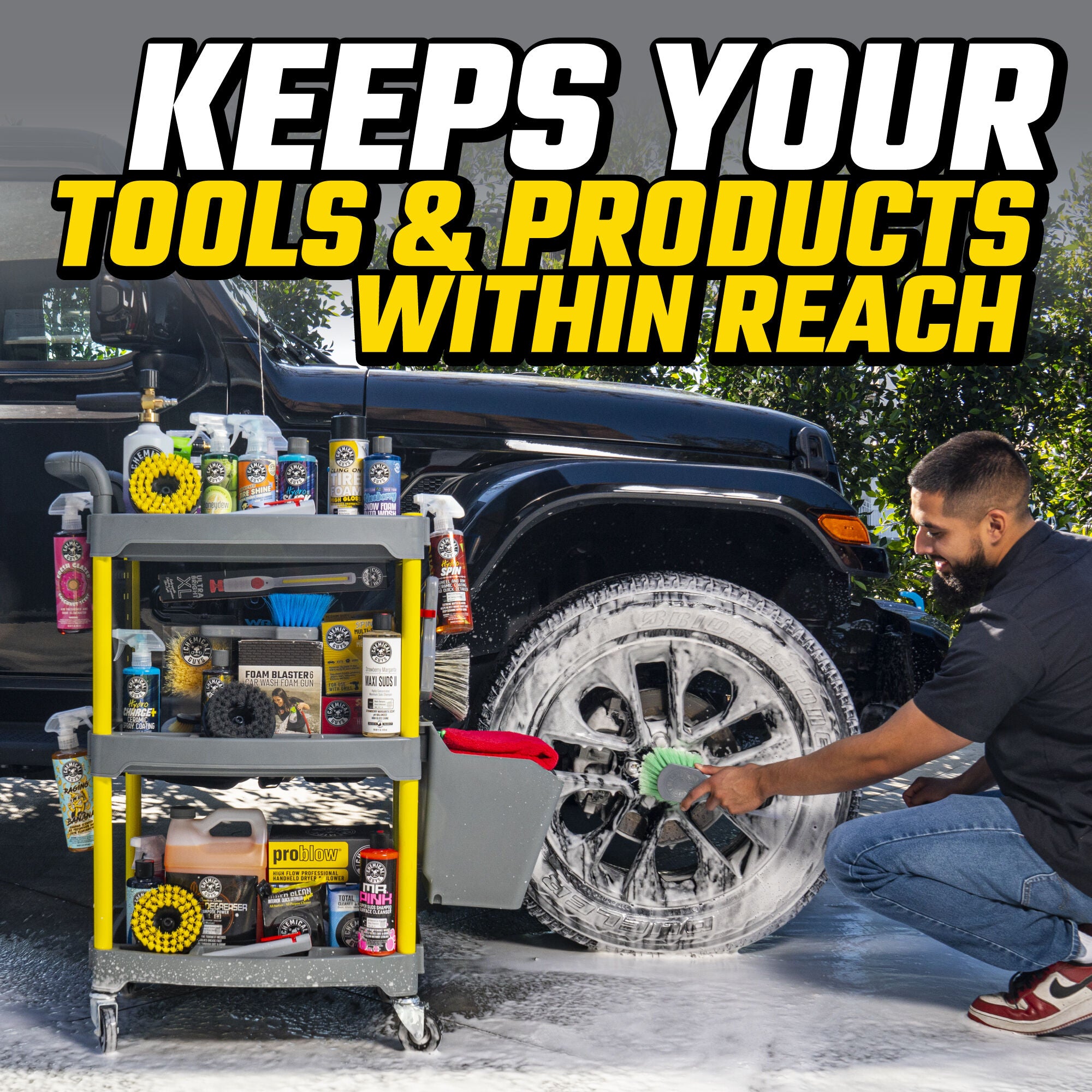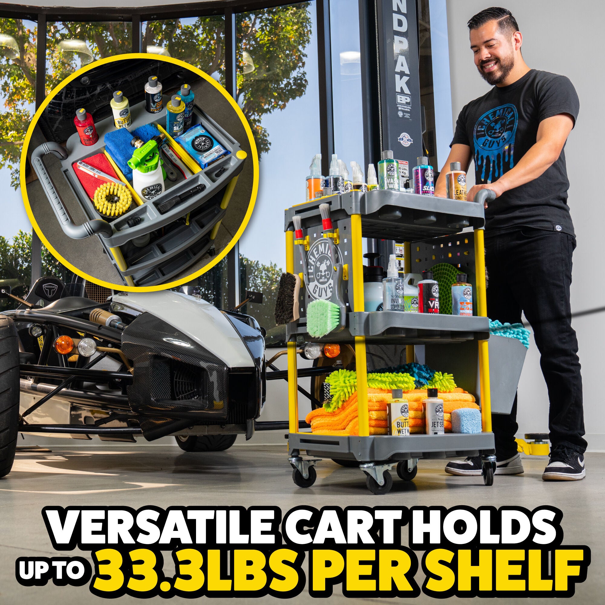 The Chemical Guys Shine Station Ultimate Detailing Cart is the customizable must-have rolling accessory to organize your detailing arsenal and take it on the go with three shelves. numerous bottle holders. hanging racks. and more.
